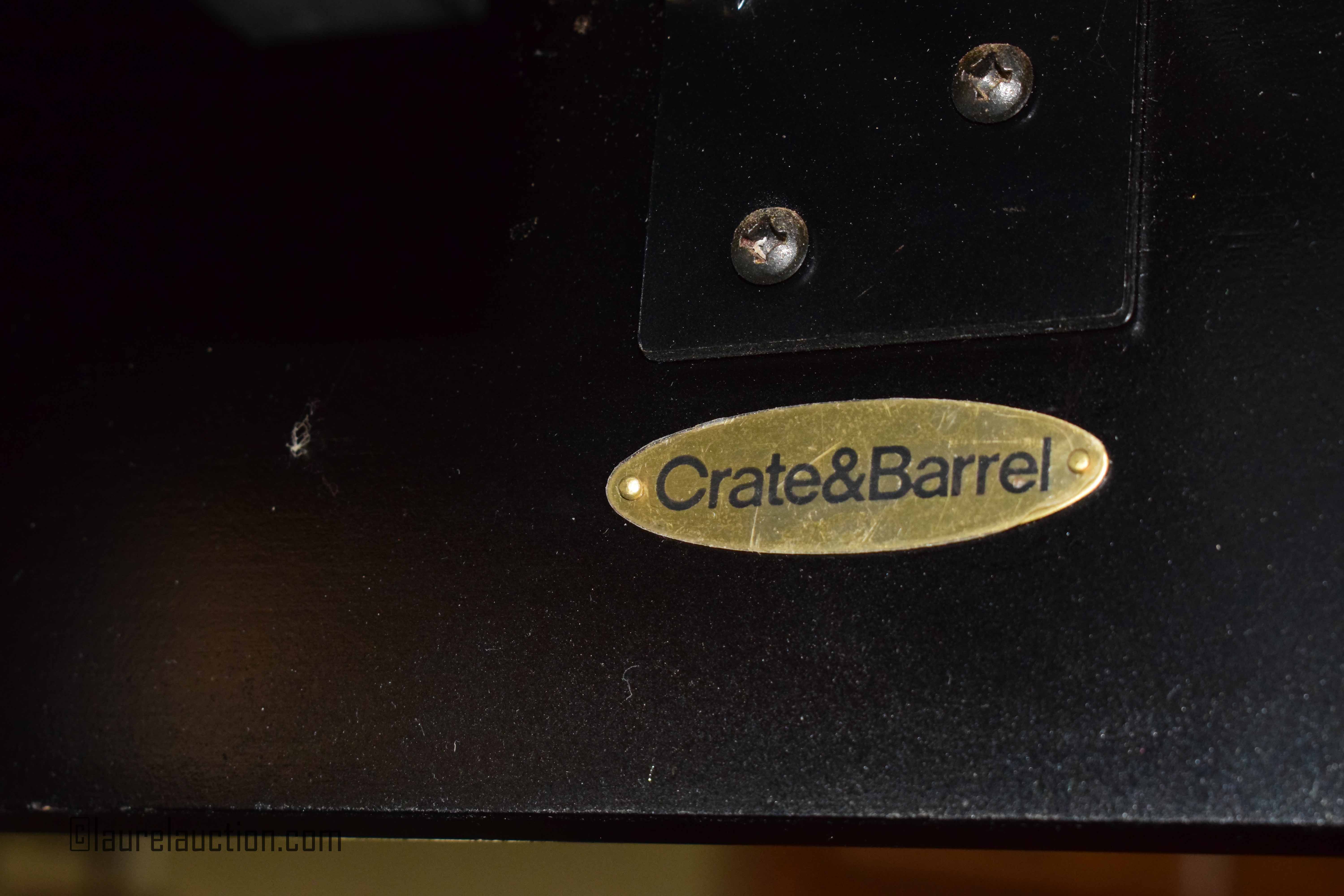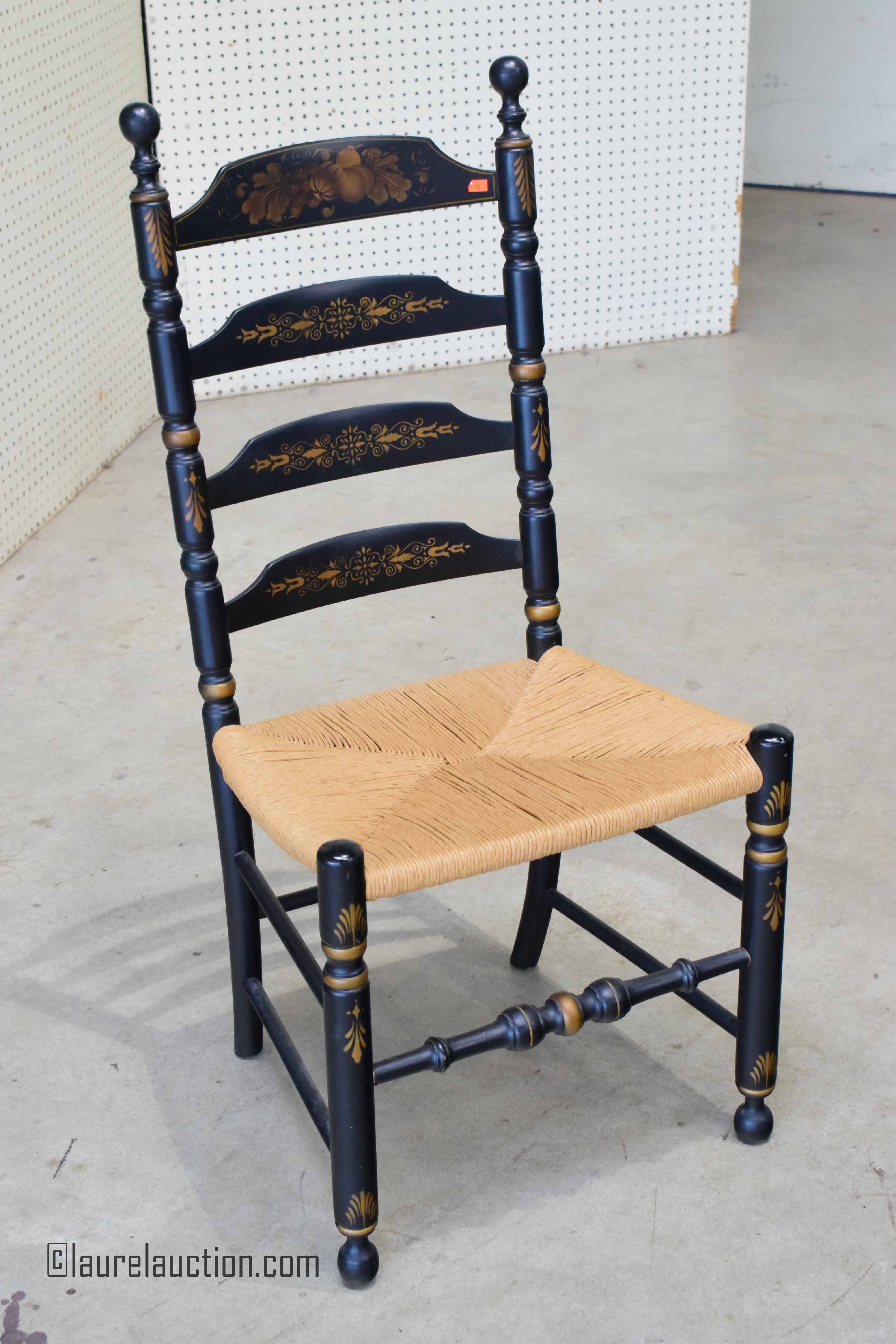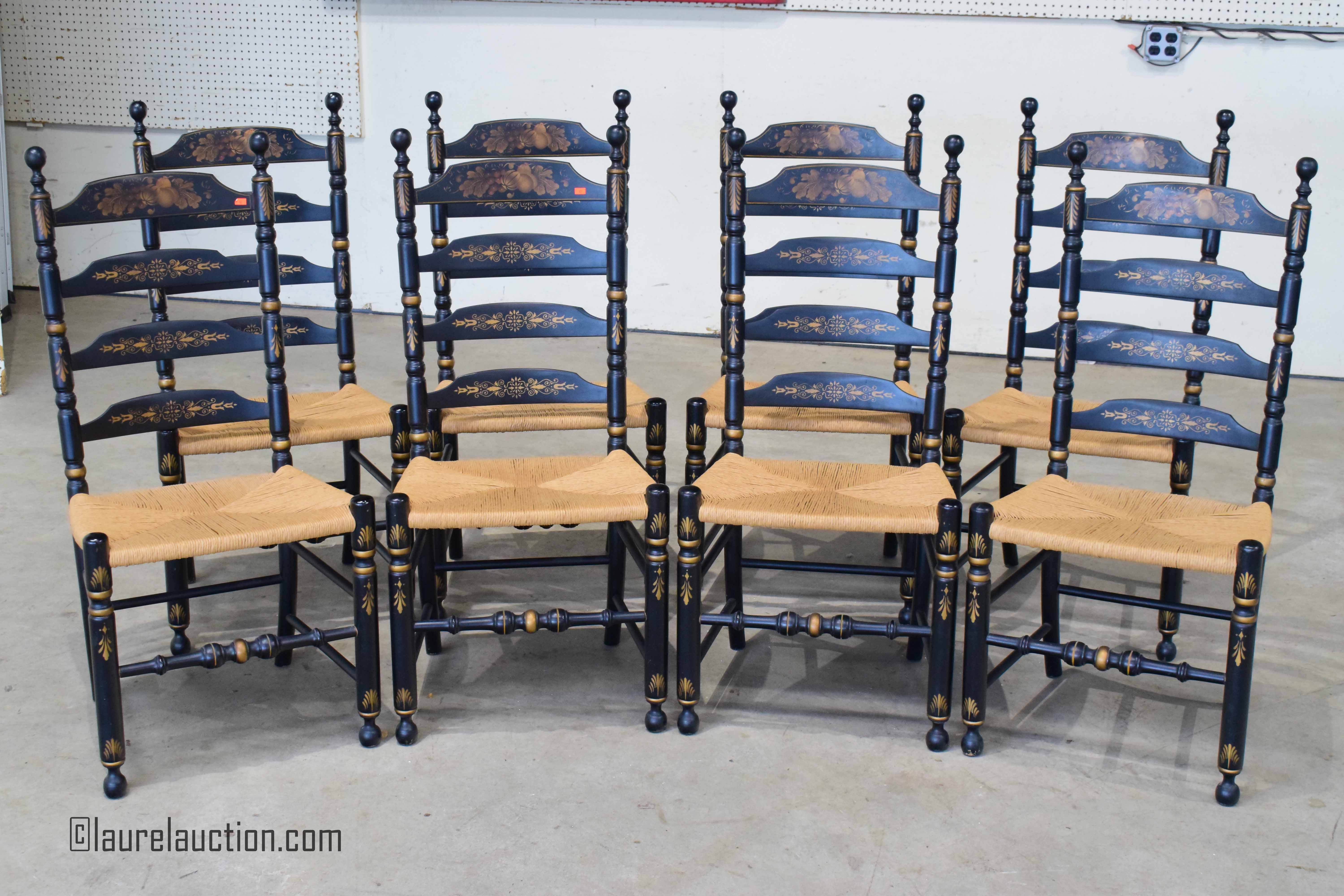 | Set of 8 Stenciled Ladder Back Chairs By: Hitchcock Paired with a Black Finished Table with 1 Leaf By: Crate & Barrel |